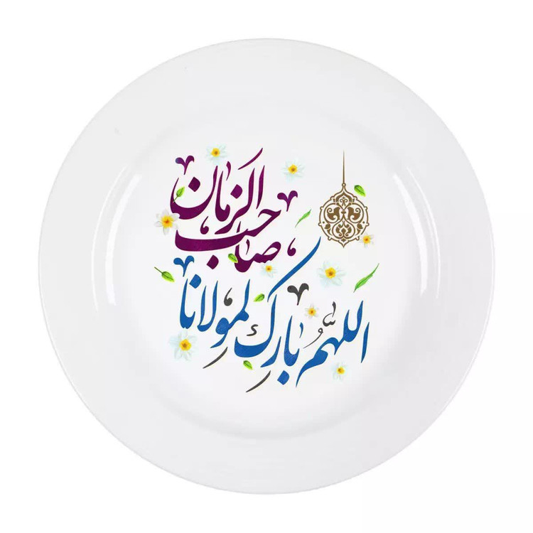 بشقاب سفید دایره طرح اللهم بارک لمولانا صاحب الزمان