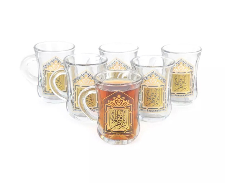 استکان کمر باریک دسته دار، ست ۶ عددی ،مزین به یا فاطمه الزهرا سلام الله علیها طرح ۵ ضلعی
