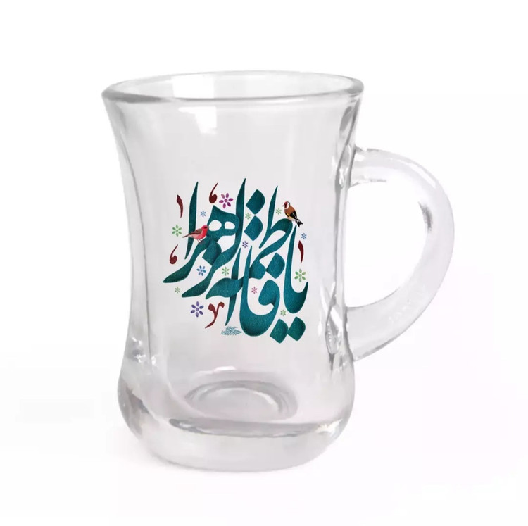 استکان تک عددی کمر باریک دسته دار، طرح بهشت ،مزین به یا فاطمه الزهرا سلام الله علیها